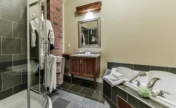 Rooms 4 and 5, also located on the north side, are less sunny but are the largest, each containing two double beds. The spacious bathrooms include a 40" rounded corner shower and a double therapeutic bath, and also benefit in winter from the gentle warmth emanating from the clay brick fireplace that runs through them. Also ideal for those who are not early risers.